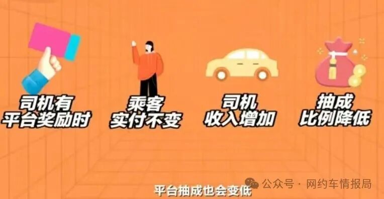 这个时候乘客实际支付的金额不变,但是司机拿到了平台的补贴,收入提高了,这时候,平台的的抽成也会降低。