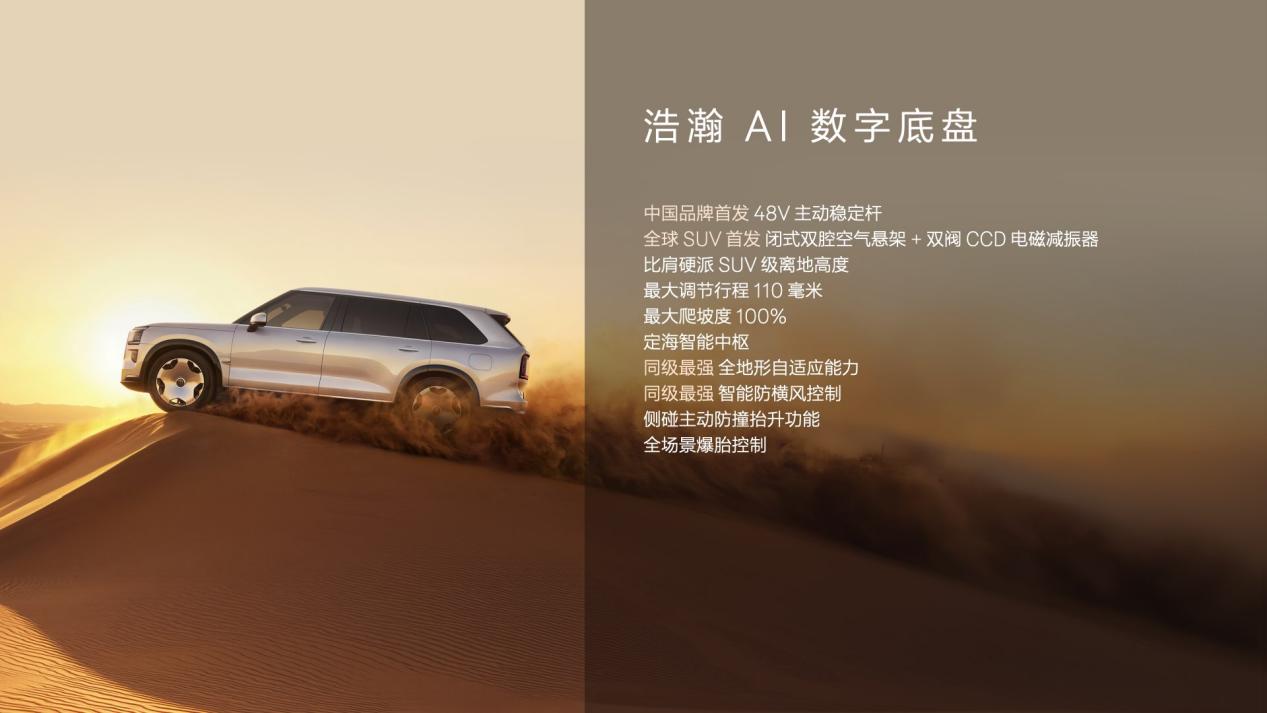 对于一台豪华SUV,底盘的调校直接决定了驾乘体验。而极氪9X搭载的“浩瀚AI数字底盘”,通过AI技术实现了智能调节,会根据不同的路况和驾驶场景,自动调整悬挂、转向力度,甚至动力分配。这意味着,无论是城市道路、山间弯道还是非铺装路面,极氪9X都能提供一种“稳如泰山”的驾驶感受。