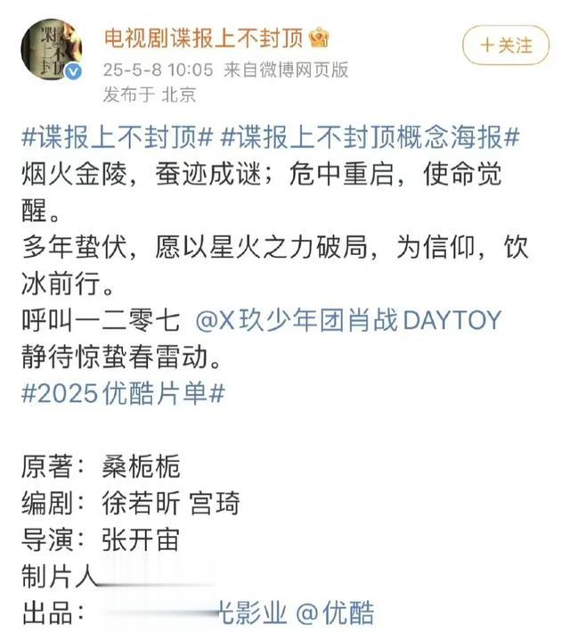 开机倒计时3天!2025年影视圈最炸裂的谍战项目《谍报上不封顶》正在上海影视乐园紧锣密鼓搭建场景。当顶流演员肖战遇上谍战王牌团队正午阳光,这场蓄力十年的"伪装者2.0"计划,早已让全网谍战迷血脉偾张。