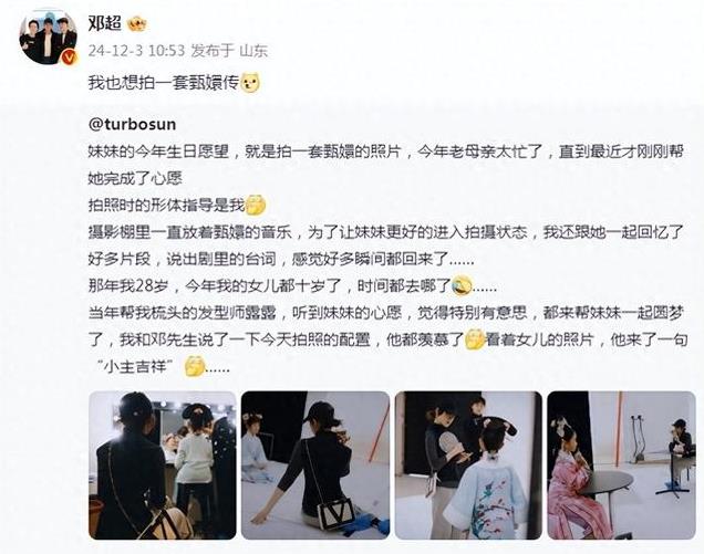 孙俪还开心透露,和老公邓超说了此次的拍摄配置后,超哥都羡慕了,并在看到女儿的照片后,不由自主地来了一句“小主吉祥”,不愧是超哥啊。而随后超哥还转发孙俪的动态,并称自己也想拍一套《甄嬛传》。所以,超哥如果要拍,该是什么角色呢,哈哈哈。
