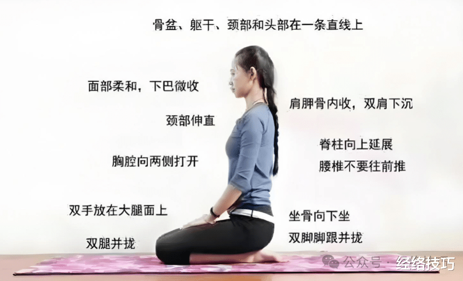 双膝并拢跪地,小腿与脚背贴地。然后,臀部慢慢向下坐,坐到脚后跟上。注意,是坐到脚后跟上,而不是保持跪姿。坐起来比较稳妥的办法是,脚趾能叠放,也能并拢,脚后跟稍微分开点。要是感觉脚踝特别紧,不能坐下,那就意味着腿部经络比较紧张。这时候可以先把脚后跟分开一点,慢慢练习。腰背挺直,但不要用力绷紧,想象头顶有一根线轻轻上提,颈部放松,双肩也随之放松、自然下垂。双手可放在大腿上,也可叠放于小腹处。