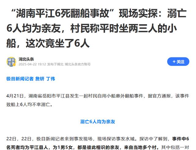 信息来源:湖北头条 2025年4月22日 《“湖南平江6死翻船事故”现场实探:溺亡6人均为亲友,村民称平时坐两三人的小船,这次竟坐了6人》