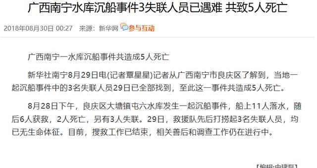 信息来源:新华网 2018年8月30日 《广西南宁水库沉船事件3失联人员已遇难 共致5人死亡》