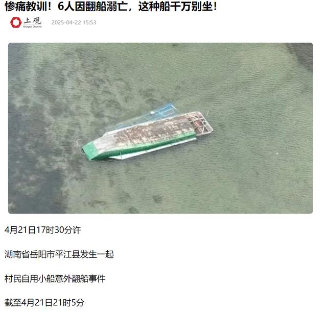 信息来源:2025年4月22日 上观 惨痛教训!6人因翻船溺亡,这种船千万别坐!