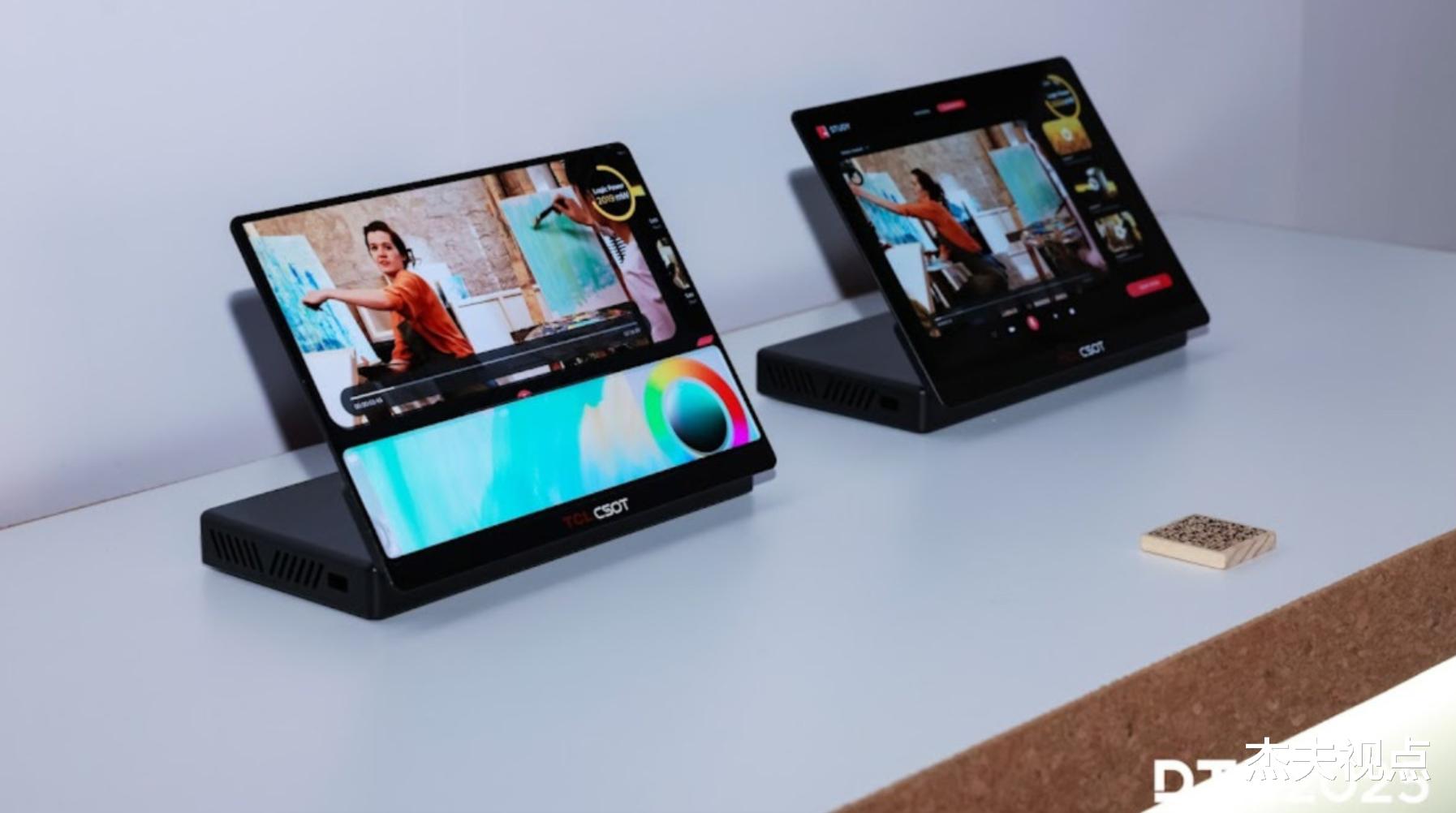 让我们比较感兴趣的还有TCL华星展出的另一款OLED面板。这是全球首款分区OLED平板用显示面板。这款13.2 英寸的OLED屏幕采用了TCL华星自主研发的分区频分 (FD) 技术,可实现屏幕同时运行两到三个分区,展示不同的画面。这种屏幕设计理念在于支持不同区域的多种应用场景,例如顶部显示文本,底部显示视频。通过1Hz至120Hz的自适应刷新率,根据屏幕不同区域的内容需求动态调整刷新率,可在保持流畅画面、清晰细节和逼真视觉效果的同时,并且降低15%至25%的功耗。