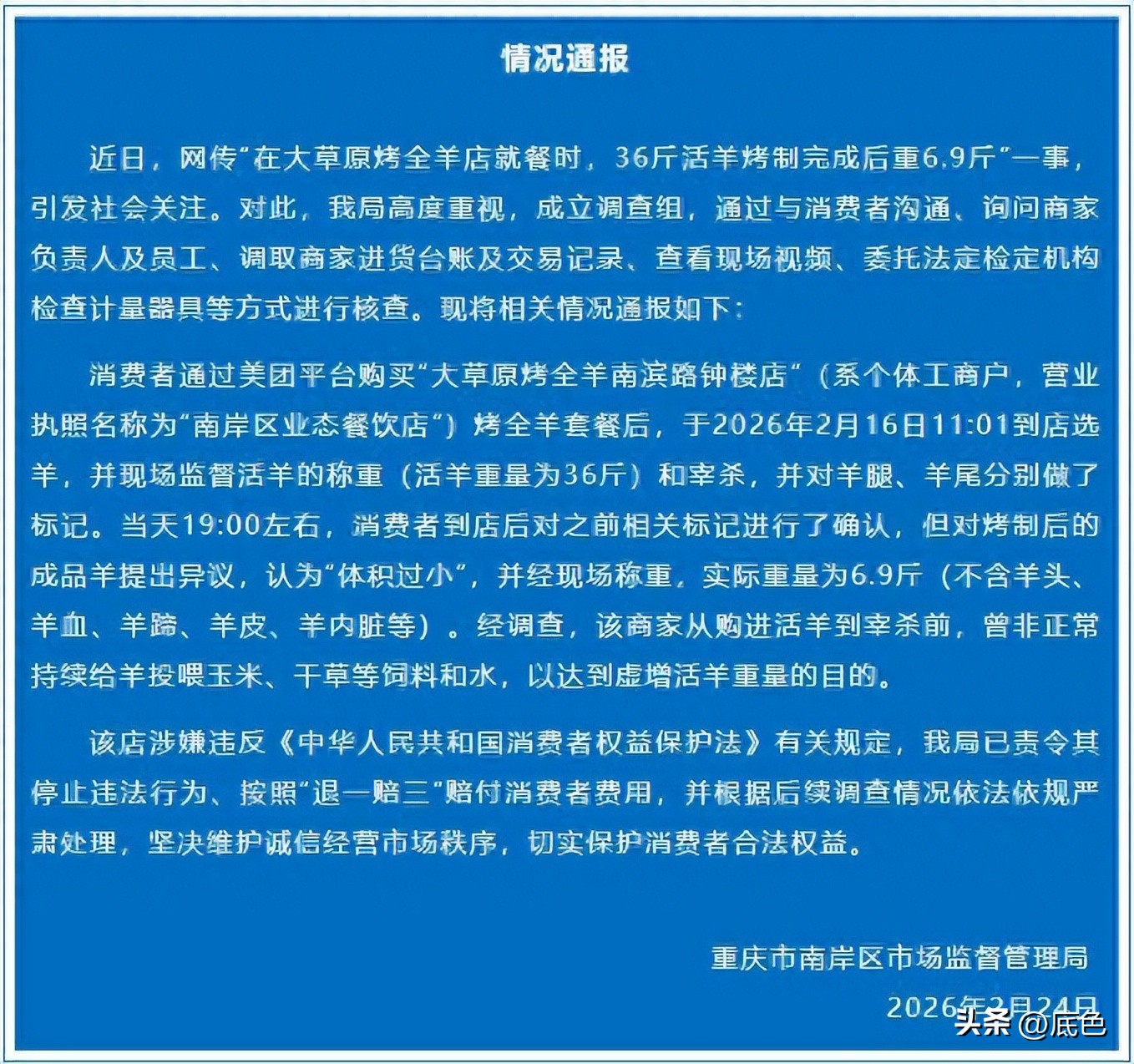近日,重庆一餐馆36斤的活羊,做成烤全羊后只有6.9斤,被顾客曝光后引发讨论。2月24日,重庆市南岸区市场监管局发通报,涉事商家在宰杀羊前,曾非正常持续给羊投喂玉米、干草等饲料和水,以达到虚增活羊重量的目的。该店被责令停止违法行为、按照“退一赔三”赔付消费者费用。