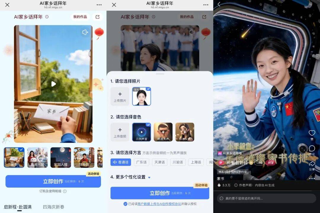 开学季上线的「少年中国说」模板,更切中跨代沟通的痛点——通过生成追梦的数字形象演绎励志文学,既是一份远方的平安报备,又以充满仪式感的方式,彰显了青少年探索未来的决心,用热血画面熨平了两代人之间的距离感。对于返校异地的高校学生,无法与家人共度佳节,AI有声家书则成了最妥帖的慰藉,将难以言表的乡愁转化为具体影像,向父母传递奋发向上的精神面貌。
