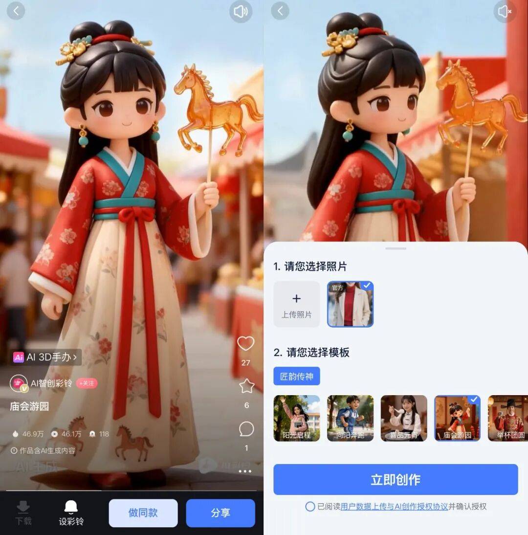 又或者在元宵节之际,看到好友发来的赏月赏灯、品尝汤圆的视频彩铃,那份生动与契合,恰好弥补了因忙碌无法亲身参与年俗的遗憾。在「庙会游园」模板中,AI将新春祝愿化作可定制的个人专属3D国潮手办,生成还原传统灯会的虚拟分身,让奔波于职场的年轻人足不出户,便能在方寸屏幕间沉浸式「逛庙会」,实现了跨越空间的情绪补偿。