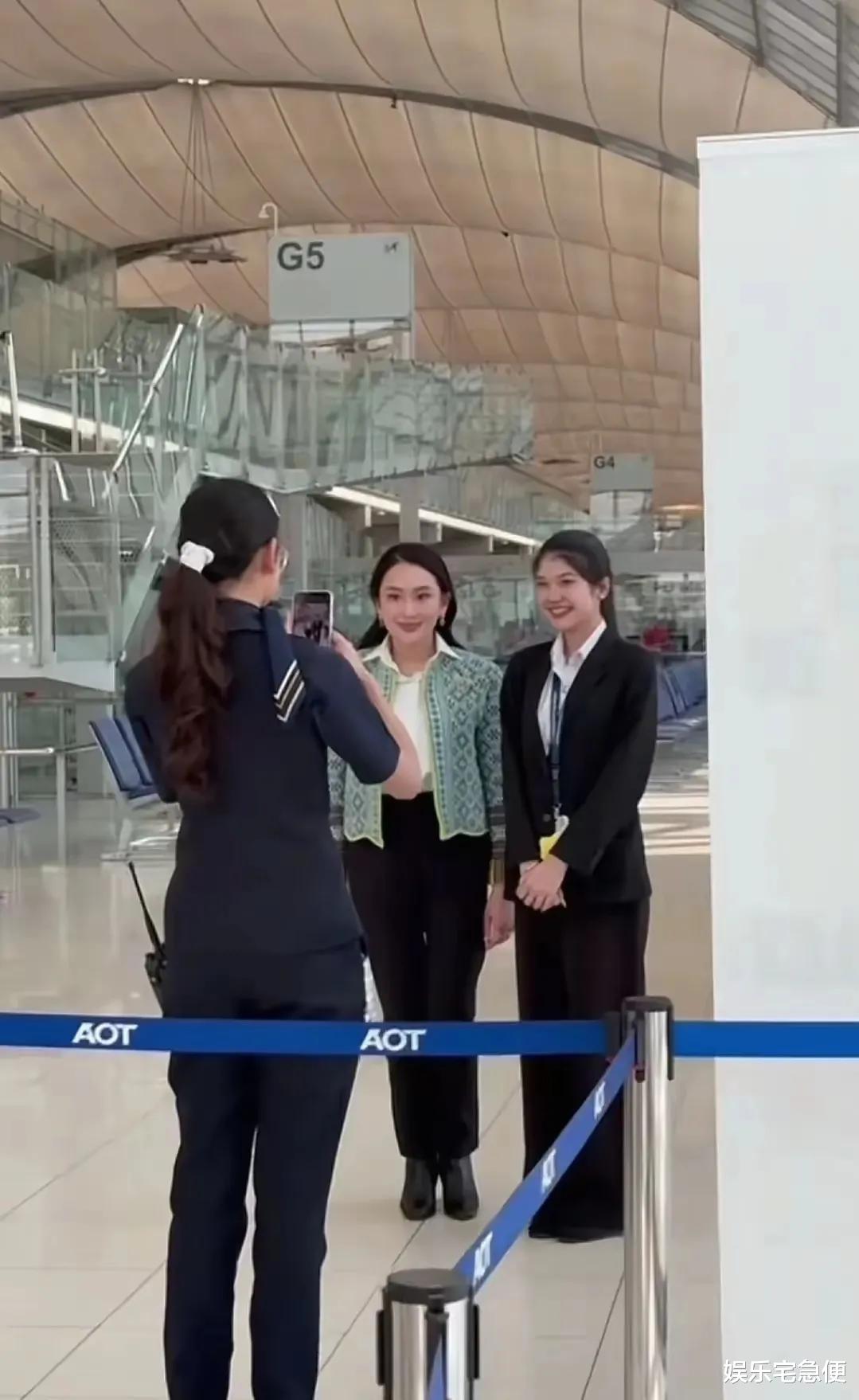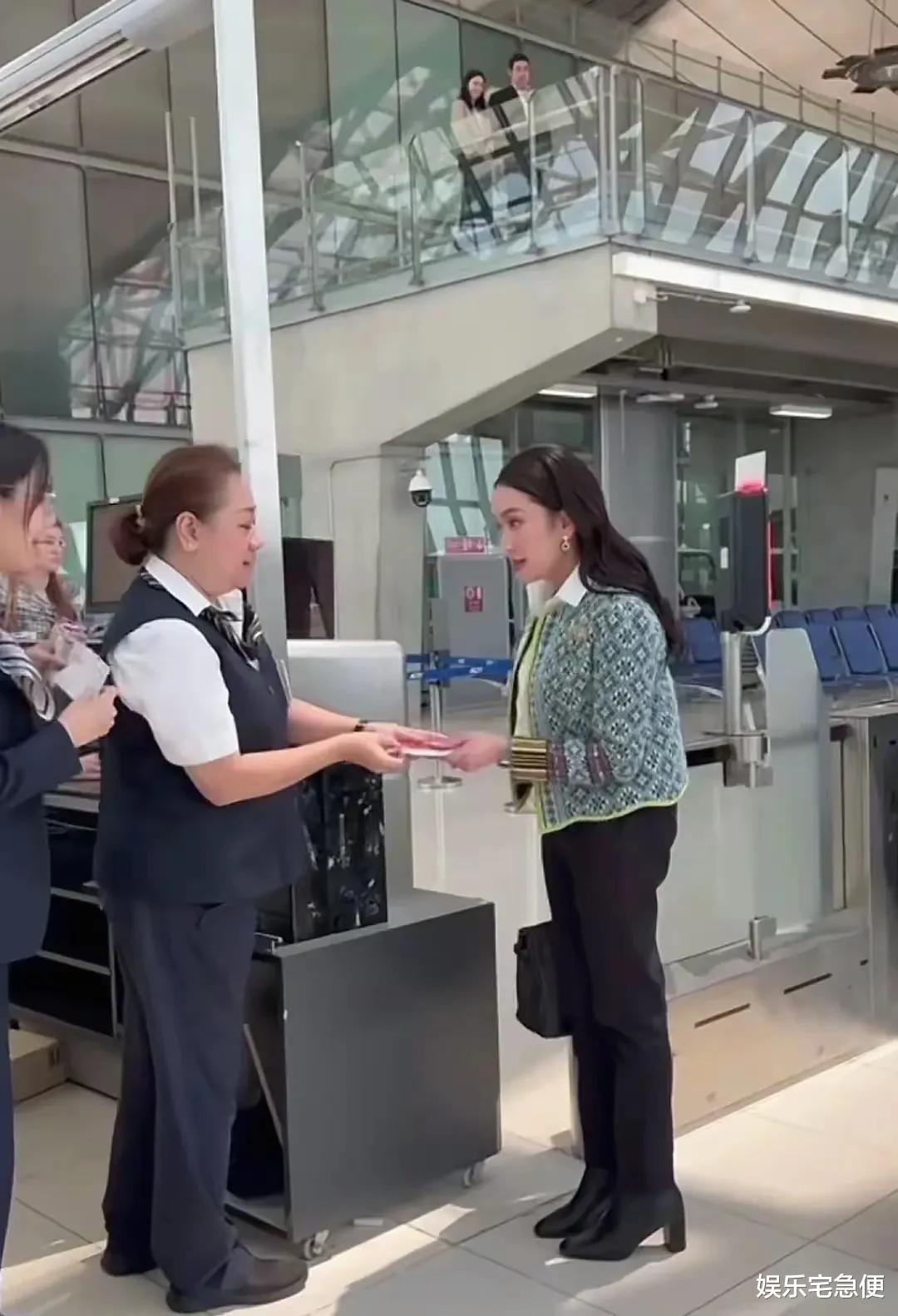她登机时,还特意跟空姐打招呼合影,十分亲民。