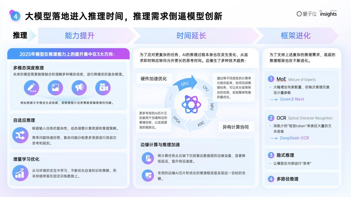 2025年,大模型落地进入“推理时间”。模型在多模态深度推理、自适应推理、边缘推理加速等方面持续突破,任务复杂度推动推理框架持续进化。