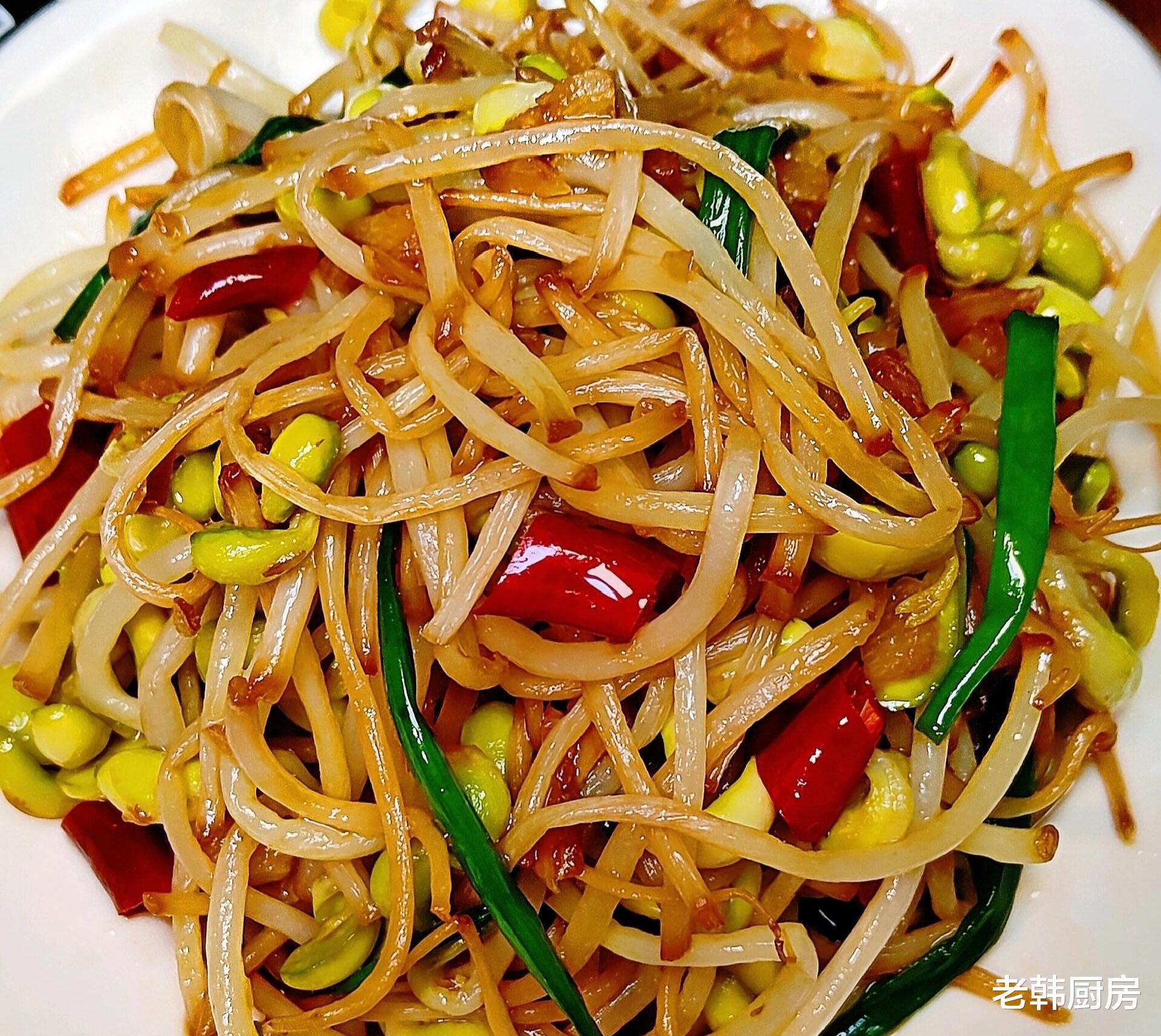做法:热油炒香蒜末、干辣椒,放入黄豆芽翻炒变软,加少许盐糖➕2勺生抽➕1勺醋翻炒入味,出锅前撒入小葱段炒匀即可~