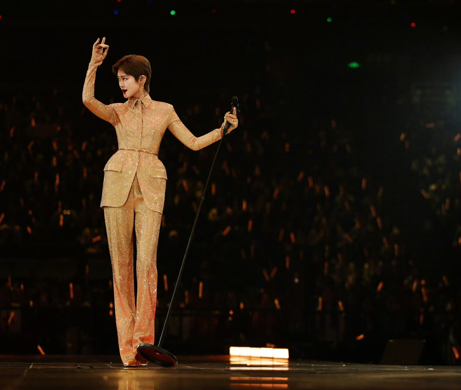 如果说红裙是惊艳了目光,那套黄金战袍,就是直接镇住了整个舞台。金属质感的面料在舞台灯光下流转着细碎的光,设计大气又有力量感,没有刻意的露肤,也没有浮夸的点缀,可她往舞台中央一站,天生的舞台王者气场就藏不住了。