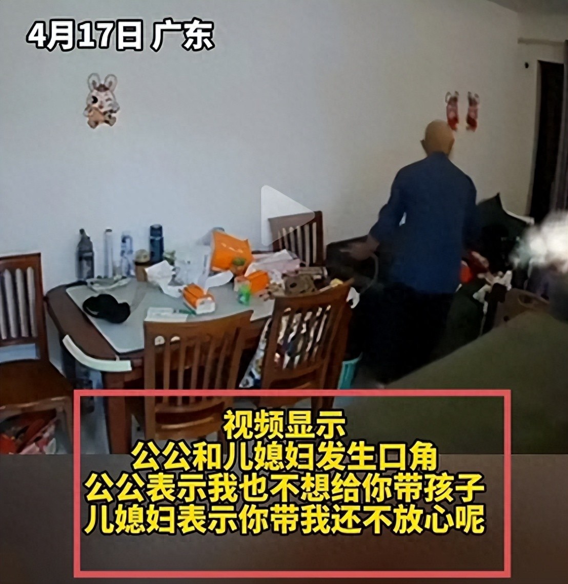 事情发生在4月17日,地点就在广东深圳的一户人家里,看起来十分普通,屋子也乱乱的,应该家庭条件一般。而画面中,公公和儿媳正在进行剧烈的争吵,应该是因为带孩子的事情。