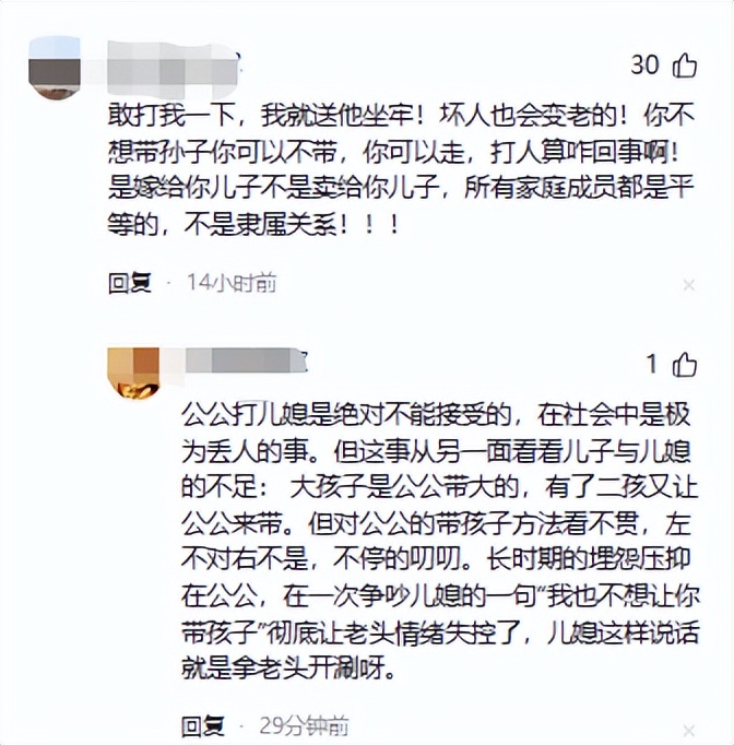 而今日,针对此事件,也有几个新消息出现。有“消息人士”透露,这家人就是自己小区的,而且这个女子有些“事特多”。这个公公好不容易带大的大儿子,这又让他带二胎,可能有些烦了,再加上女子老是对他吆五喝六,压抑久了,老头就爆发了。