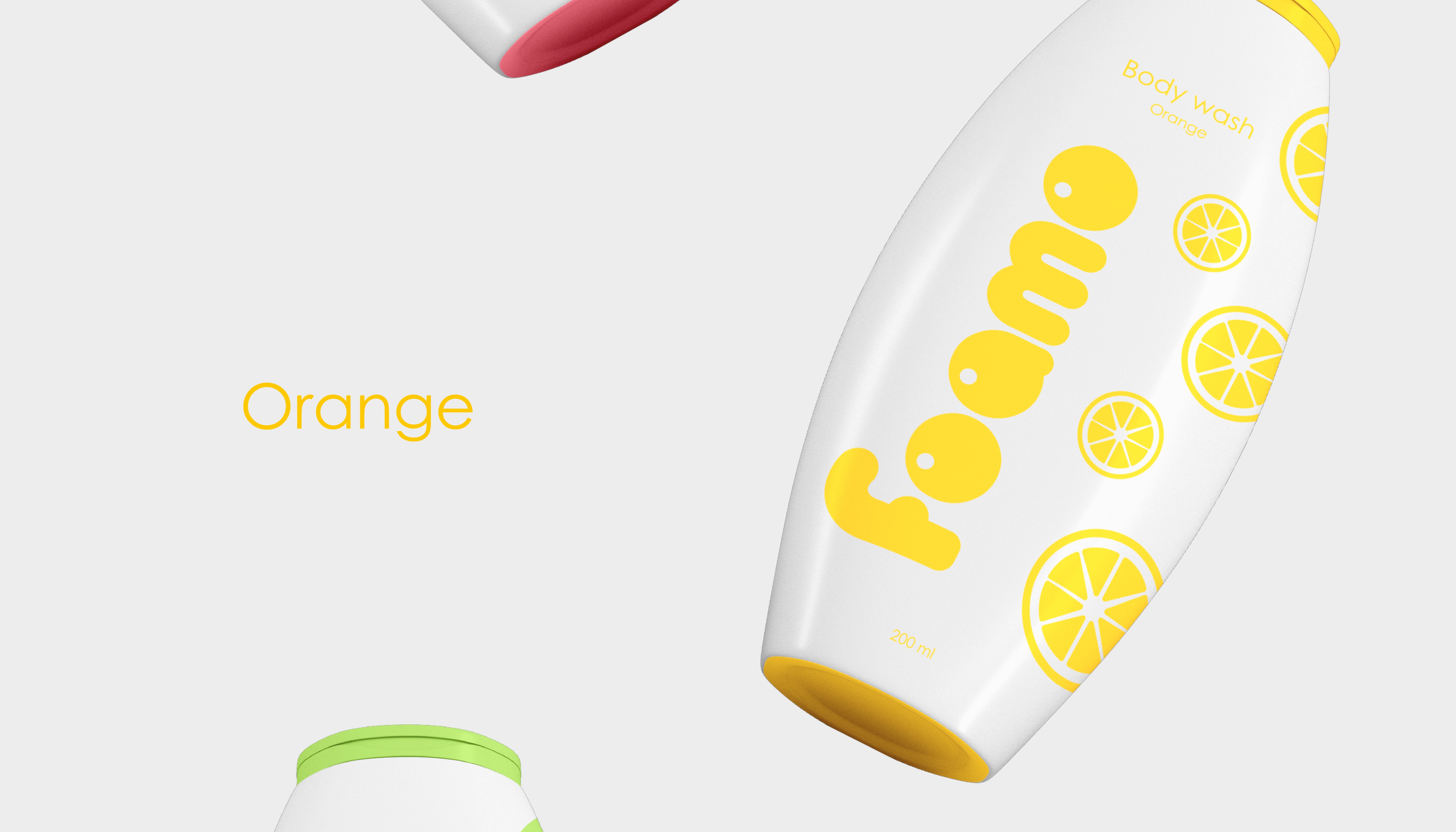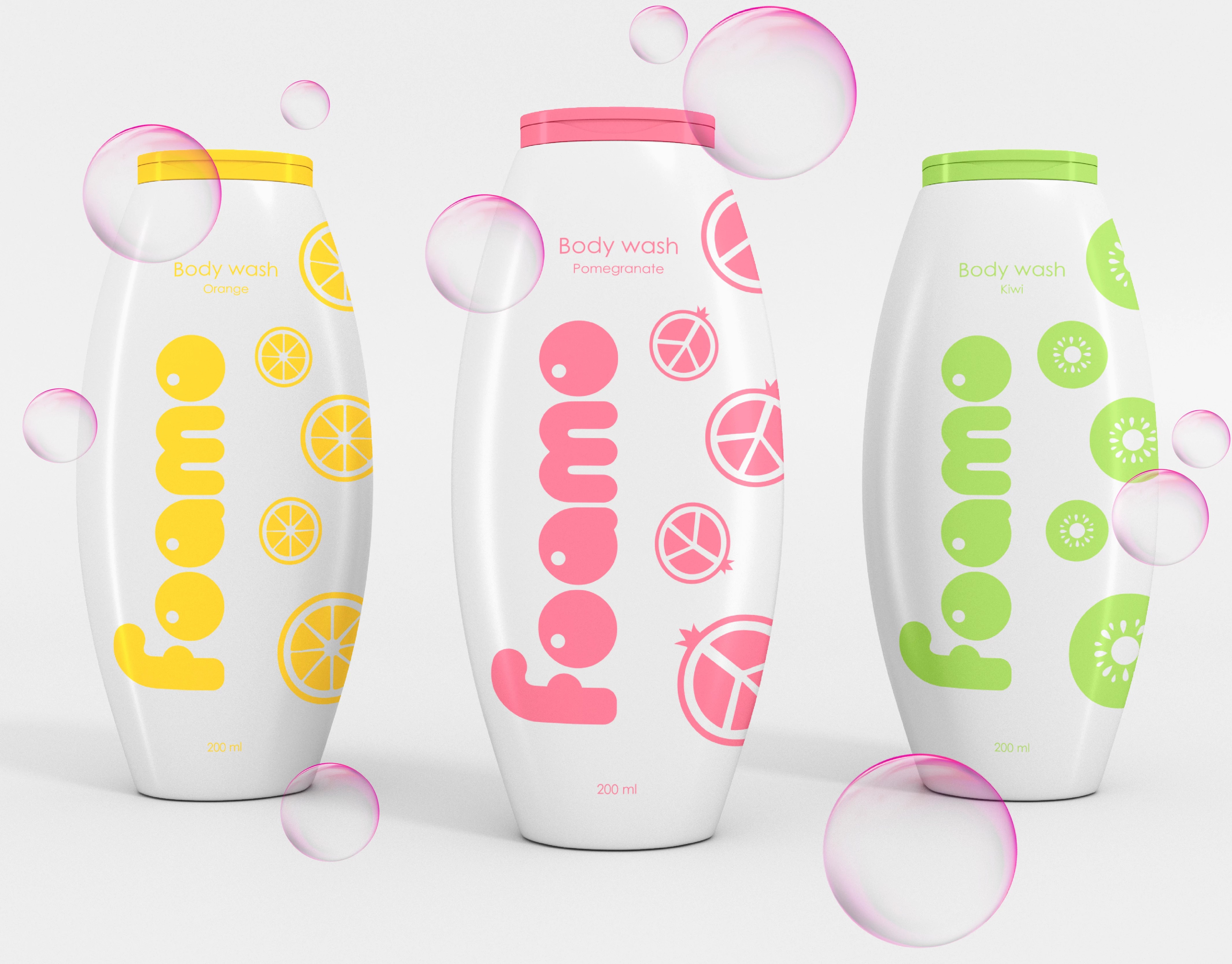 再看Foamo 沐浴露:这哪是包装,明明是 “把水果榨进瓶里”!椭圆瓶身裹着软乎乎的色彩,柠檬黄、石榴粉、奇异果绿直接 “通感” 到香味;“foamo” 的字体像泡泡一样圆滚滚,配上水果切片 + 和平符号的趣味图案,连瓶身都在冒 “清爽甜香” 的泡泡 —— 拿在手里就像攥着颗刚剥开的水果,洗澡的快乐从拆包装就开始了。