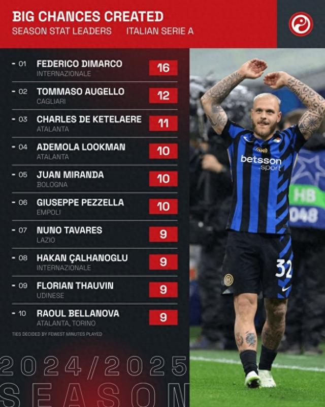 本赛季意甲创造重大机会排名: