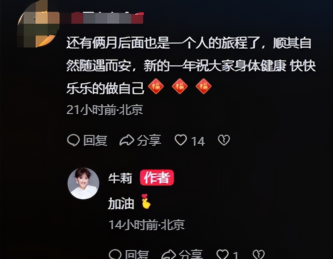 接着,咱们来看看网友们的反应。评论区那叫一个热闹,各种猜测都有。有说她离婚了的,也有说她只是感慨人生的,还有人说她这是在为新作品宣传造势呢!各种说法都有,真真假假,分辨不清。更有意思的是,牛莉本人对很多评论都回复了,唯独对“离婚”这个猜测,她既没承认也没否认,这就更让人浮想联翩了。你想啊,这要是真没什么,她干嘛不直接解释清楚?