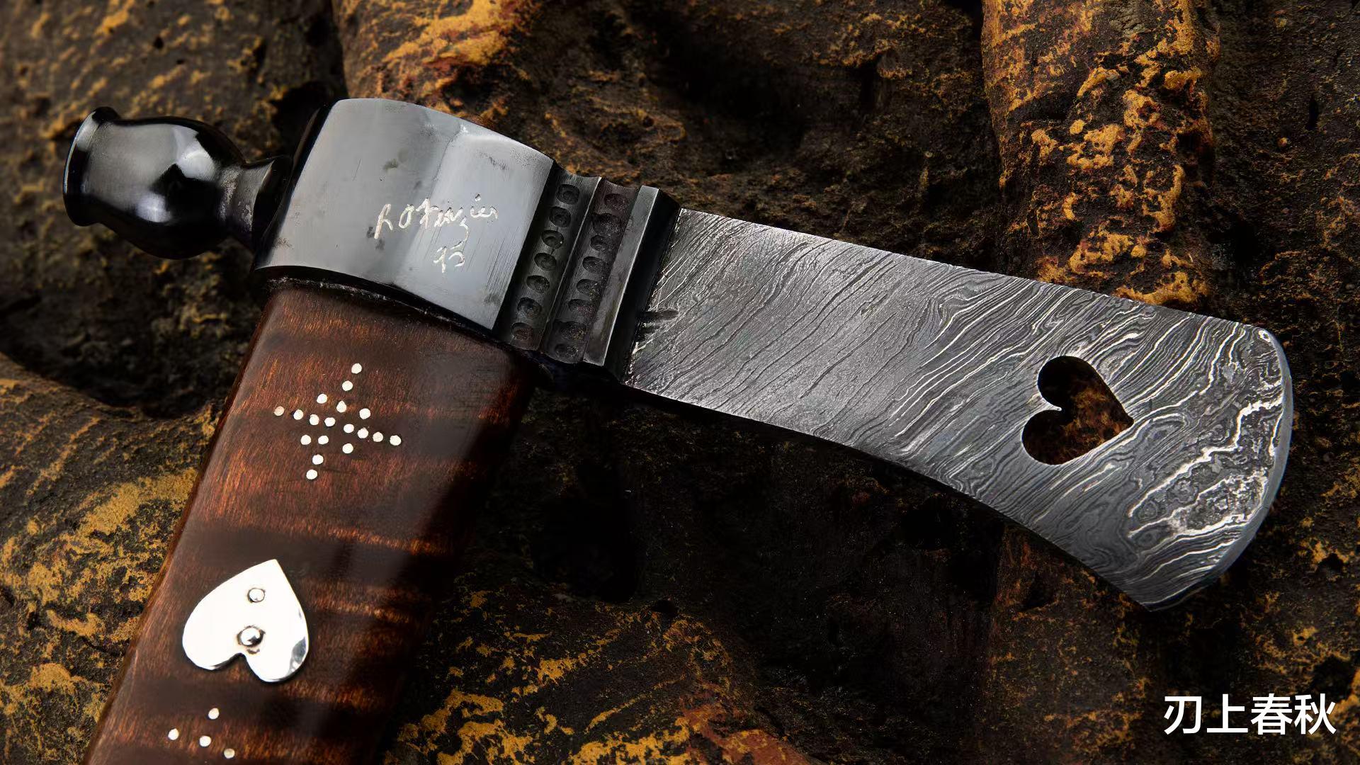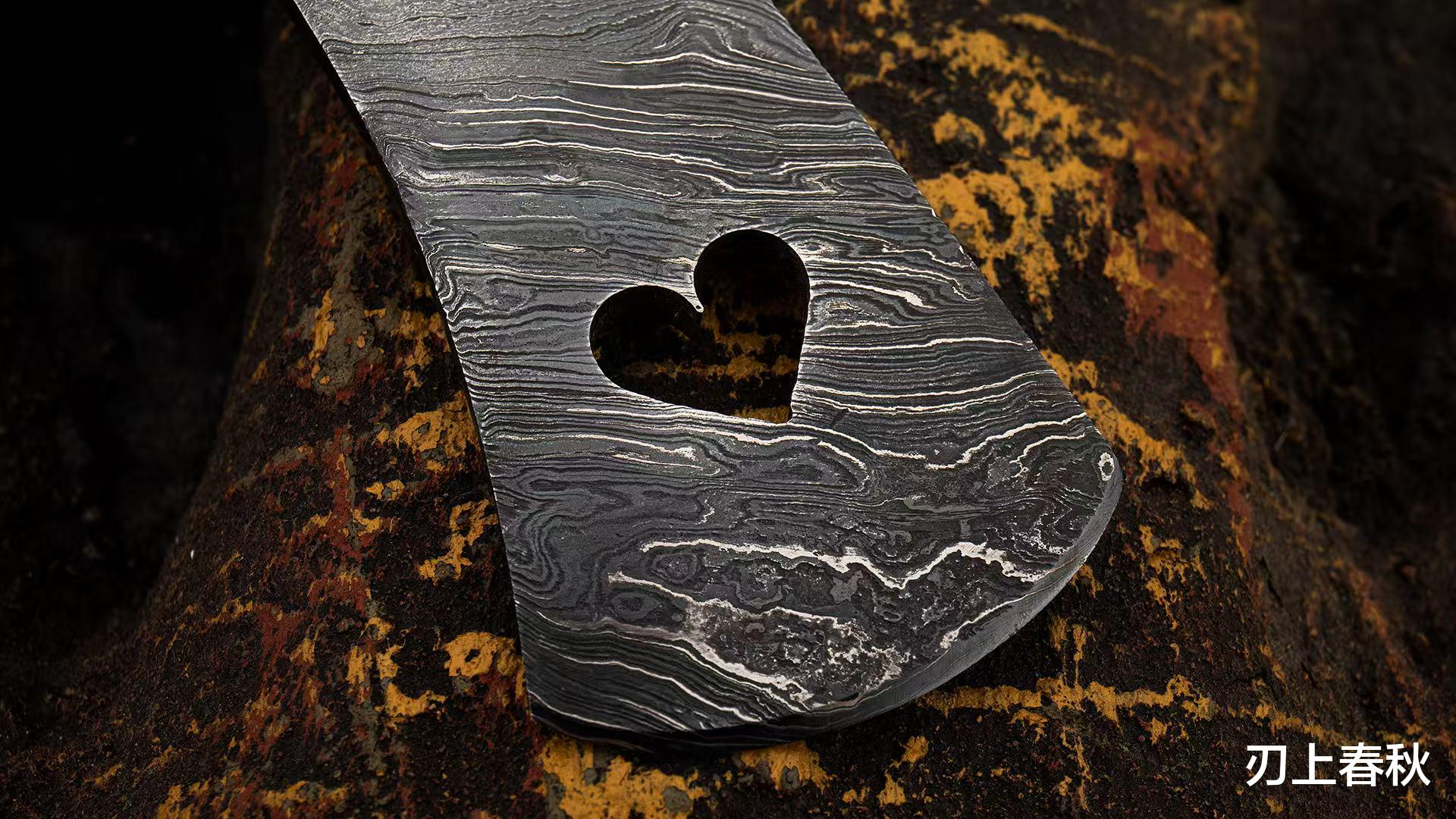 此战斧以美洲原住民风格为设计灵感,整体造型显得古朴同时又富有野性之美。全长约42.5厘米,裸重315克,拿在手中,既具分量又不失灵动。其斧刃用珍贵的大马士革钢锻造,那独特的花纹古朴且动感满满,仿佛在诉说着古老的故事。中心的桃心形镂空设计,更是画龙点睛之举,为这硬朗的武器,增添了些许细腻与浪漫。