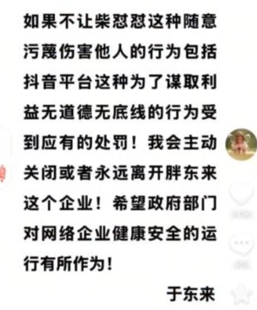 首先是面对柴怼怼事件,胖东来的老板于东来直接在社交平台上表明了自己的态度。