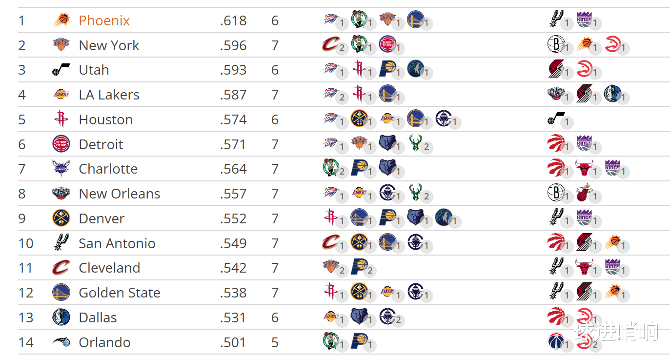 在剩余赛程难度极高的情况下,太阳队目前还没有积攒战绩优势,已经排在第11名的位置,落后第十的国王1.5个胜场。