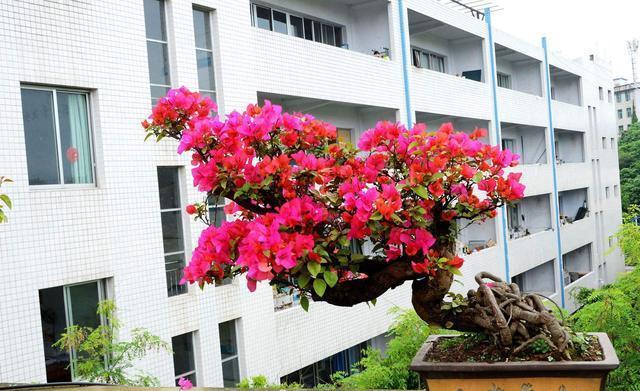 三角梅造型多样,可以根据个人喜好制作成双杆、单杆、临水式、花篮式等。