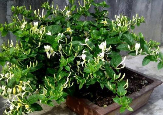 金银花盆景以悬崖式和垂枝式最为美观,能够充分展现其动感的姿态。
