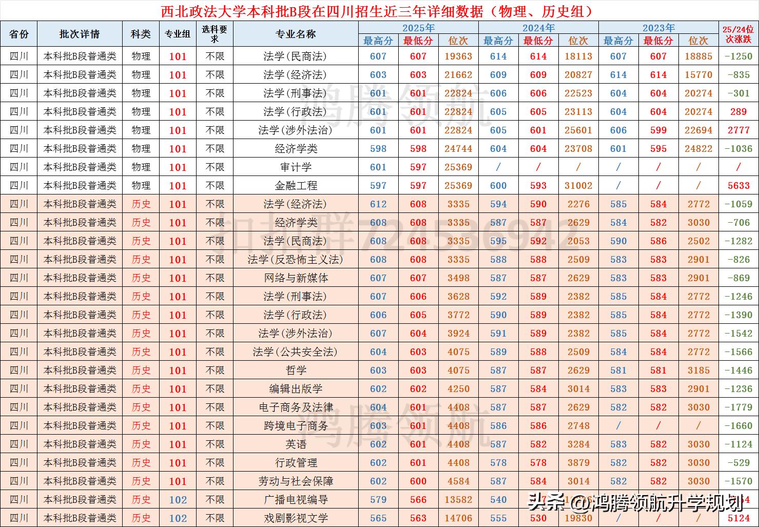 西北政法大学2025年在四川本科批B段历史类设2个专业组,101组含16个专业,其中包含主力法学类专业,再选科目要求为“不限”,录取分数为600,排名4584位次,各专业录取位次不同程度下滑;