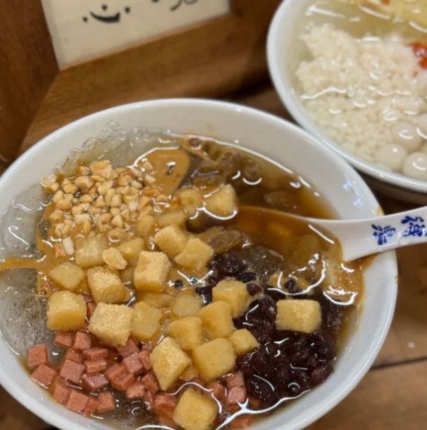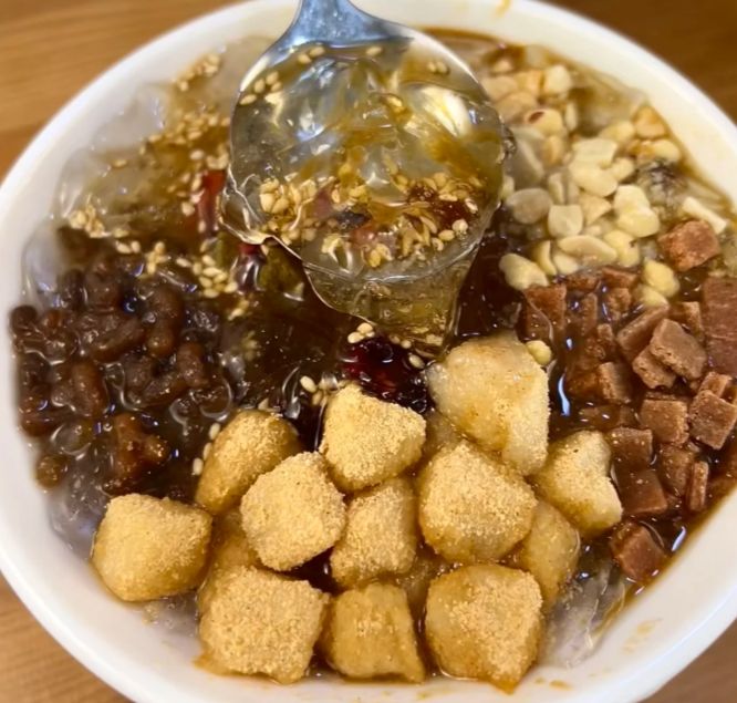 组装是风味汇聚的时刻。将凝固好的冰粉用刀划成小块,舀入碗中。其上放入几块黄豆粉糍粑,再依个人喜好,撒上炒香的花生碎、山楂片碎、熟白芝麻,有时还可以加入葡萄干、枸杞等果干。最后,画龙点睛的一笔在于红糖浆——将块状红糖加水慢熬,直至汤汁变得浓稠、色泽深沉、甜香醇厚,微微放凉后,徐徐浇淋在冰粉与配料之上。深琥珀色的糖浆缓缓渗透,浸润着每一块冰粉与糍粑。