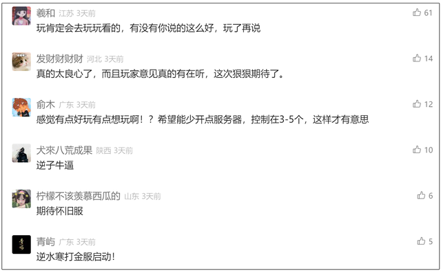 乍看之下,《逆水寒》怀旧服似乎有“炒冷饭”的嫌疑,不过,这也是官方在收集了数千条玩家意见之后,想要带领玩家重回629那个充满激情、同时搬砖玩家可以遍地捡钱的黄金时代,因此不少人也表示会回归看看。