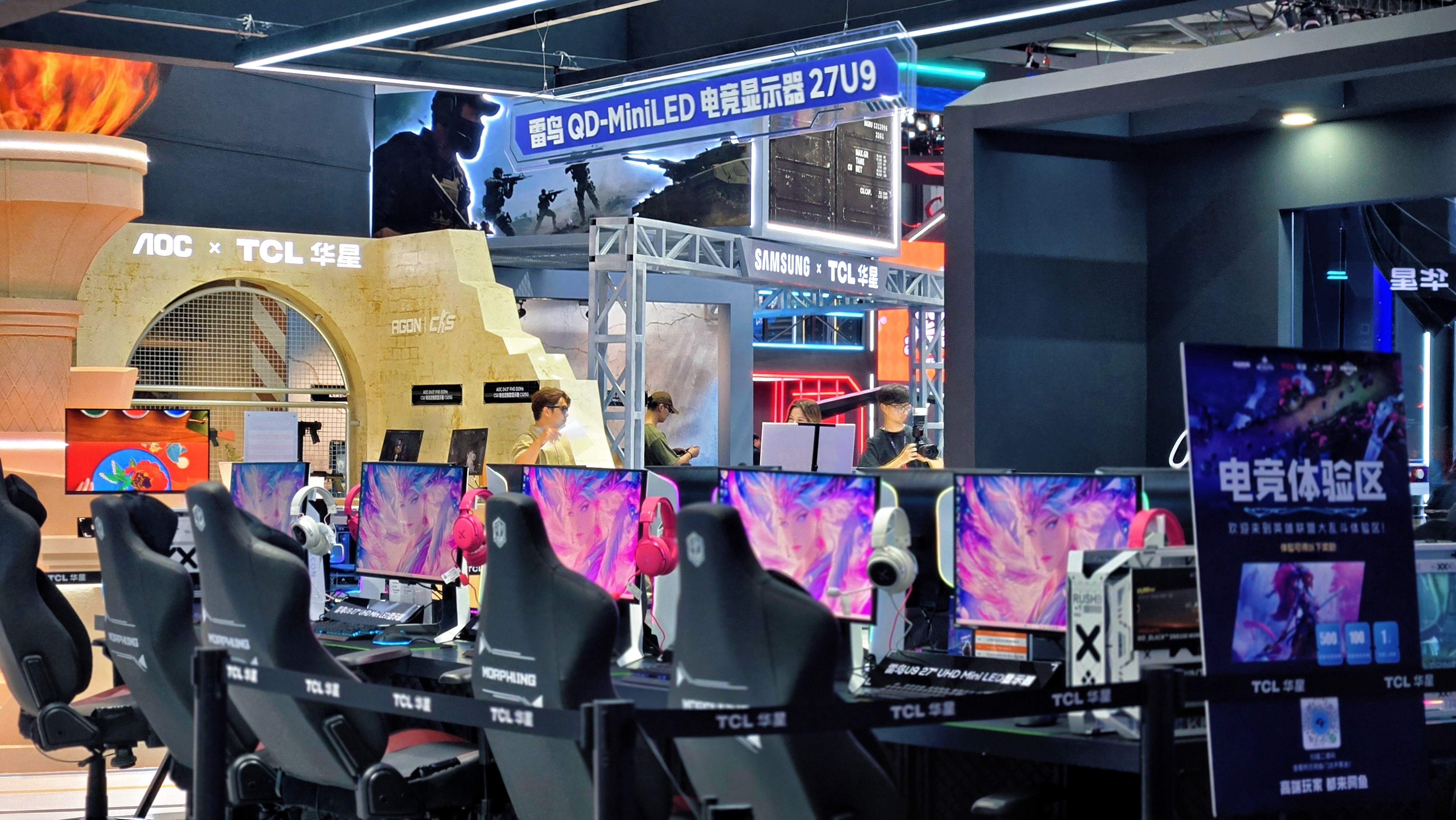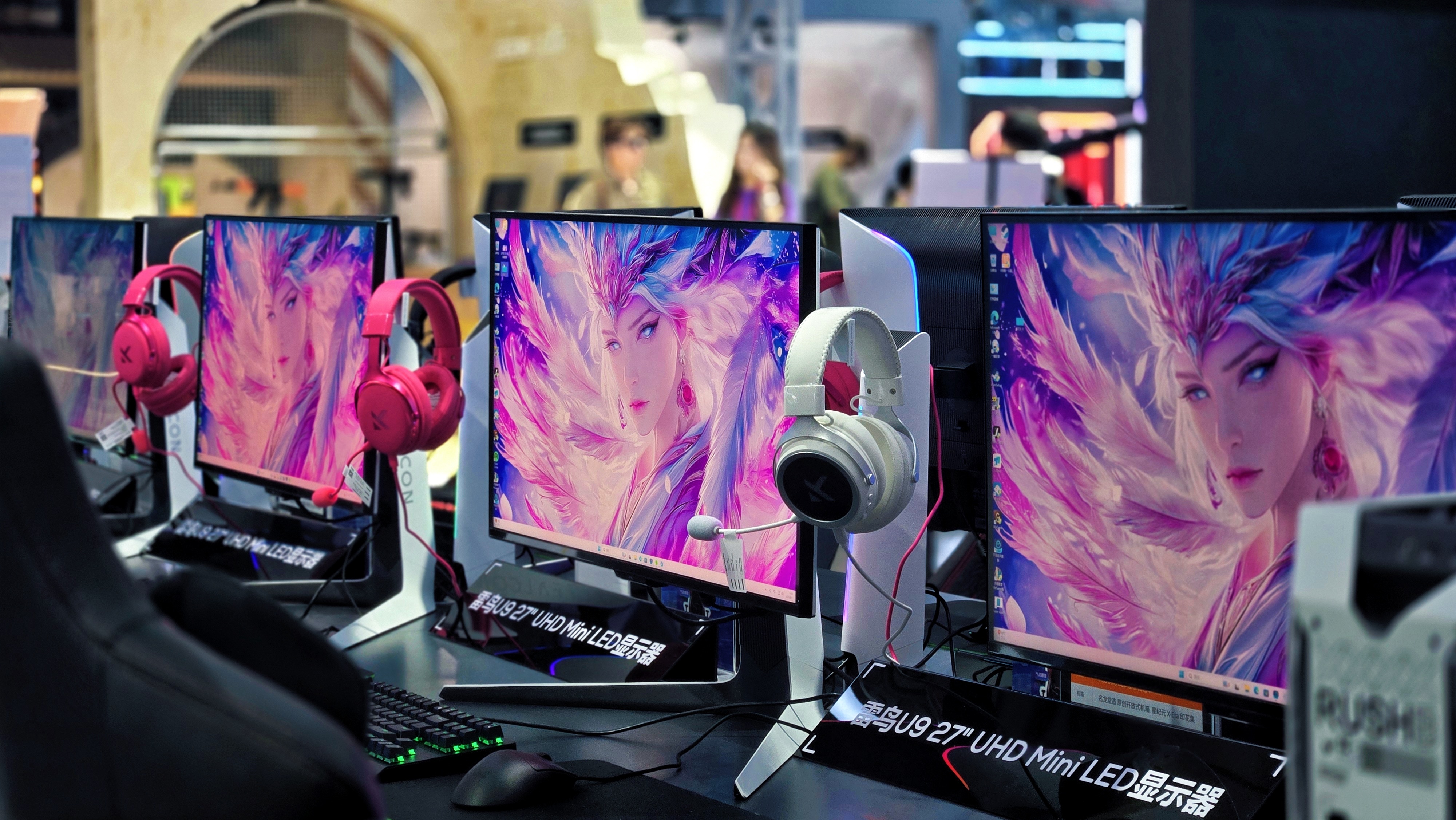 雷鸟展台最核心的,绝对是和网鱼网咖联手搞的「雷鸟x网鱼电竞体验区」!十台雷鸟27U9显示器一字排开,组成了超有感觉的《英雄联盟》对战区。我手痒也上去试了一把,哇塞!4K画质超清晰,165Hz高刷新率,加上1ms的响应速度,操作起来那叫一个“丝滑”!走位、放技能,感觉跟手得不行,完全没有拖影卡顿,简直电竞神器!