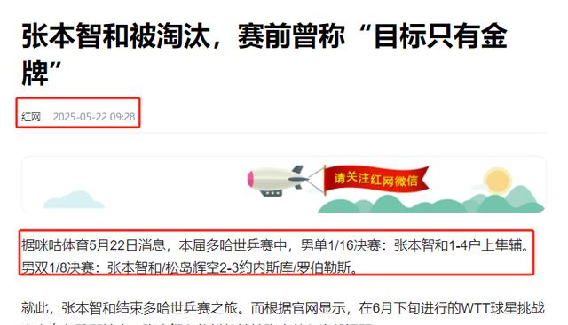 信源:红网 2025年5月22日关于“张本智和被淘汰,赛前曾称“目标只有金牌””的报道