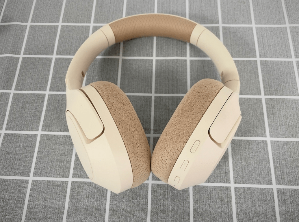 这款耳机外壳用的是磨砂塑料材质,摸起来手感还不错,戴在头上也不觉得压。耳罩是全包式的,里面的海绵软硬适中,透气性也还可以。头梁内侧有橡胶垫,贴着头部挺舒服,能分散一部分压力。不过,新耳机刚戴上时会有点夹头,头围大的人戴久了可能会觉得脑袋被压得有点难受,得戴几天适应适应才行。耳罩可以转动,不用的时候折起来收纳,挺方便的。
