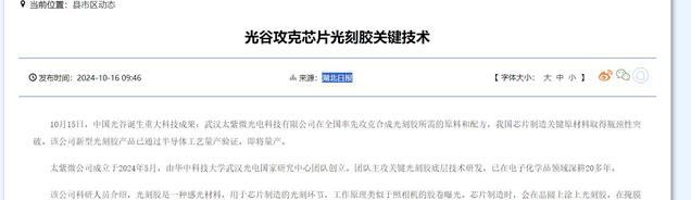 【2】中国光谷-《光谷创造,国产光刻胶通过量产验证!》(2024-10-15)