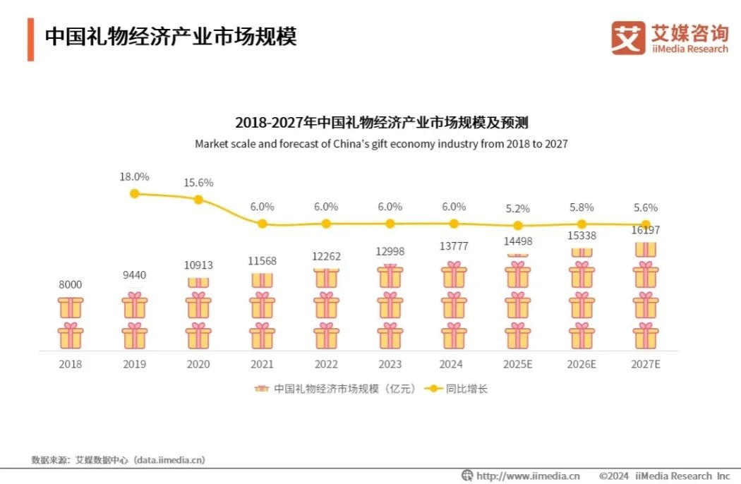 iiMedia Research(艾媒咨询)数据显示,2024年中国礼物经济市场规模将达13777亿元,预计2027年达16197亿元。中国礼物经济产业市场规模呈逐年递增趋势。艾媒咨询分析师认为,随着中国礼物经济产业的逐渐增长,未来将吸引更多的市场参与者关注。
