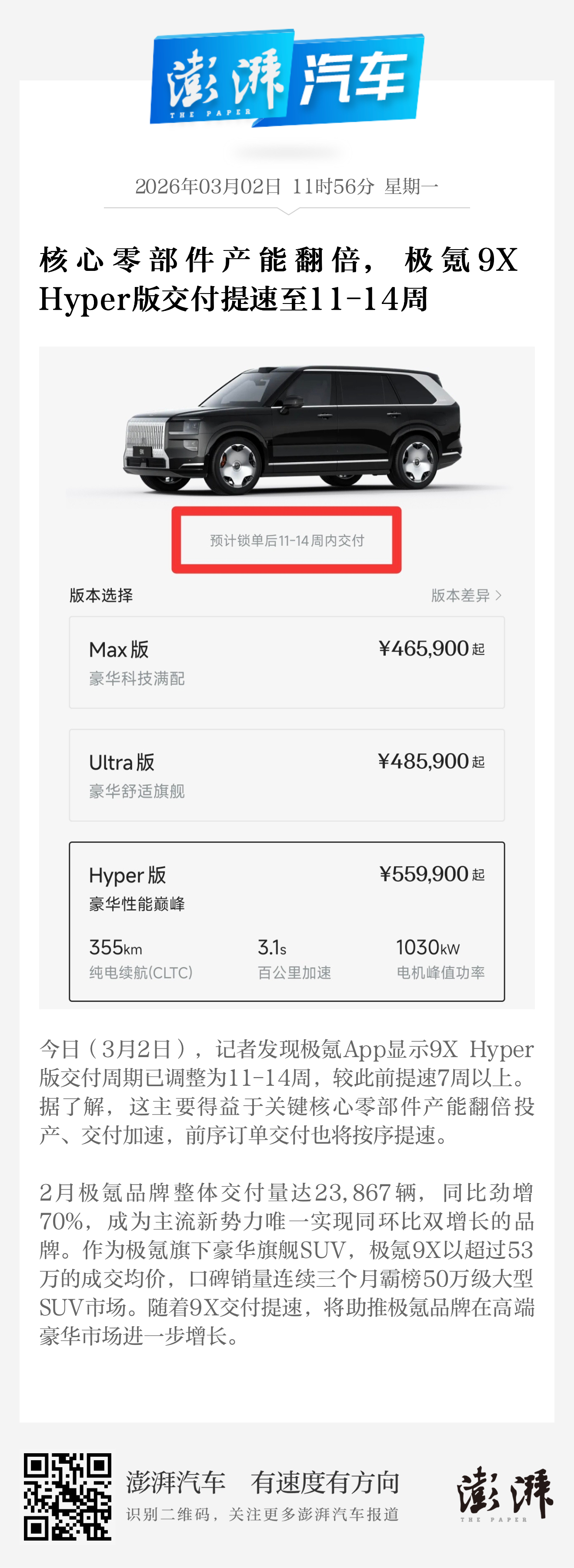 产能猛提7周以上!极氪9X Hyper交付全面提速!