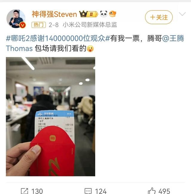 小米经理王腾曾带着团队包场去看电影,情人节的时候极氪公司带全体员工一起去看《哪吒2》,还有法拉第未来创始人贾跃亭也包场支持《哪吒2》。