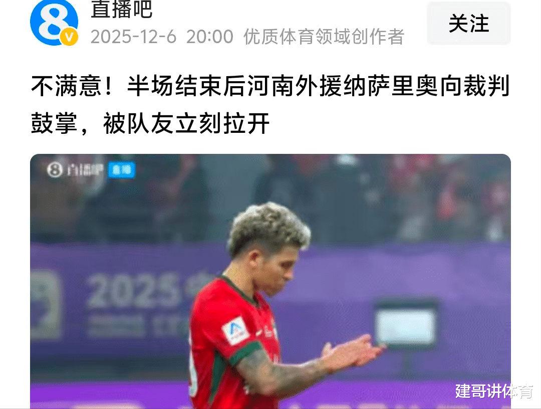 北京时间12月7日,在河南队0-3输掉了足协杯冠军后,感觉这场输球并不是河南队最终的结果,根据直播吧的爆料,河南外援纳萨里奥对执法这场比赛的韩国裁判高亨进进行了鼓掌,虽然他被队友立刻拉开,但他的鼓掌也被转播镜头抓住,感觉下个赛季纳萨里奥或许真的要难逃处罚了。