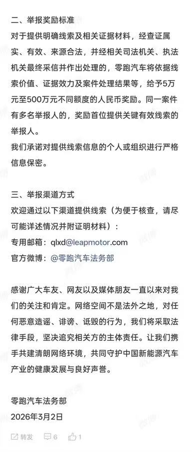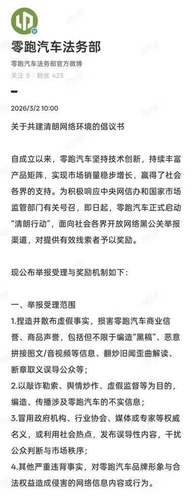 3月2日,零跑汽车正式发布《共建清朗网络环境倡议书》,启动“清朗行动”,面向全社会开放黑公关举报渠道,并设立单条线索最高500万元的奖励机制。在行业竞争日趋激烈、网络黑产屡禁不止的当下,这一举动不只是一次企业维权,更像是一次对行业生态的主动纠偏。