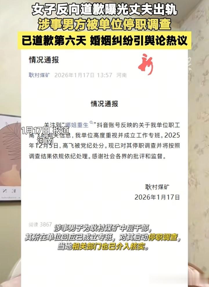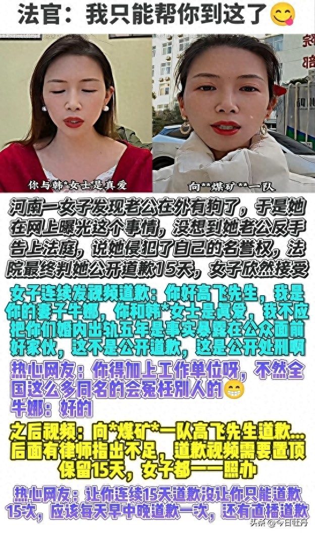 2025年12月,河南有个叫牛娜的女子开始在网上发视频,她按照法院判决每天录制一条道歉内容,起因是她把丈夫高飞出轨的事情发到了网上,原本计划拍15条,结果前四天发布的视频一下子火了起来,单日播放量超过千万,到了第六天,她的丈夫高飞被单位停职,外遇对象韩某也被调去洗煤厂工作。