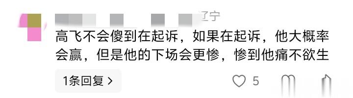 另有网友推测“高飞”不会起诉,因为即使胜诉也会面临更严重的后果,他说:“高飞不会傻到在起诉,如果在起诉,他大概率会赢,但是他的下场会更惨,惨到他痛不欲生。”