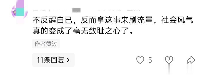 还有网友批判当事人借事件炒作,感叹社会风气变差,他说:“不反醒自己,反而拿这事来刷流量,社会风气真的变成了毫无无耻之心了。”