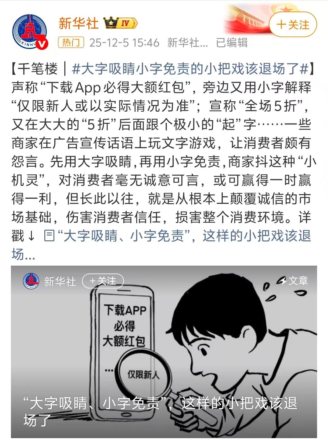 近日,新华社刊发题为《“大字吸睛、小字免责”,这样的小把戏该退场了》的评论文章,直接向厂商惯用营销套路开炮了。