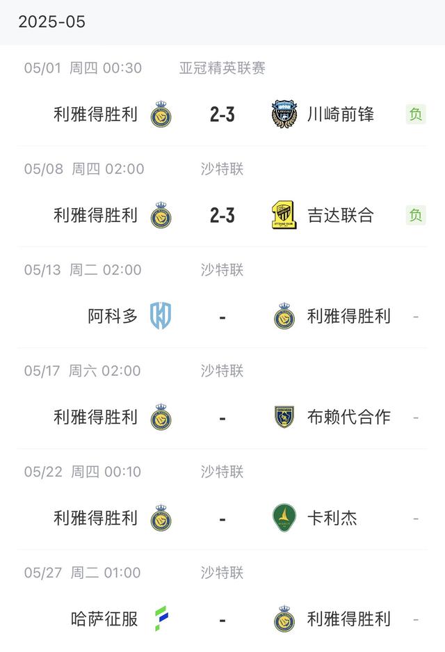 直播吧05月08日讯 沙特联第30轮,利雅得胜利遭遇让二追三,2-3输给吉达联合,目前积60分排名第四位,按此排名不仅将无缘亚冠精英联赛,还将错过沙超杯。