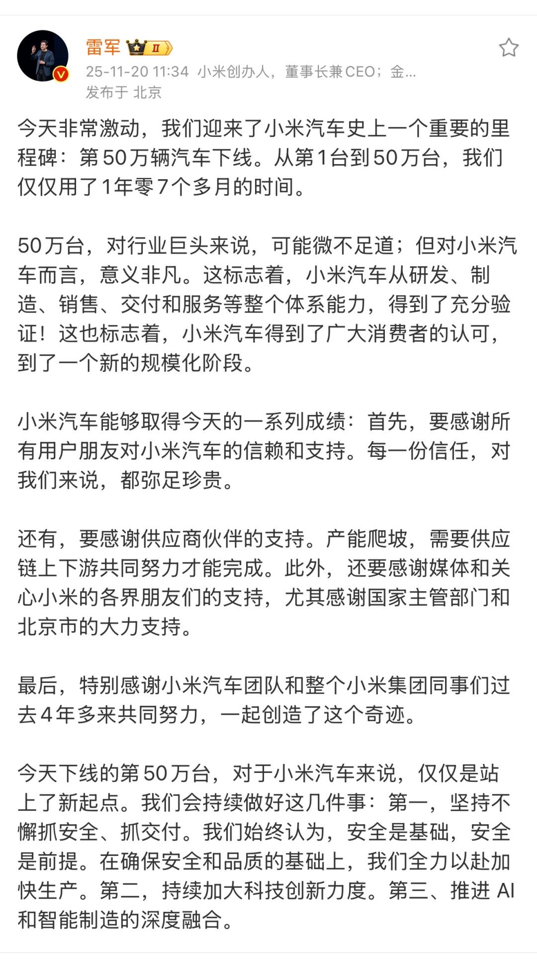 在11月20日,小米汽车方面称,第50万辆车在北京经济技术开发区的小米汽车超级工厂下线,总用时约20个月,刷新中国新能源行业纪录。