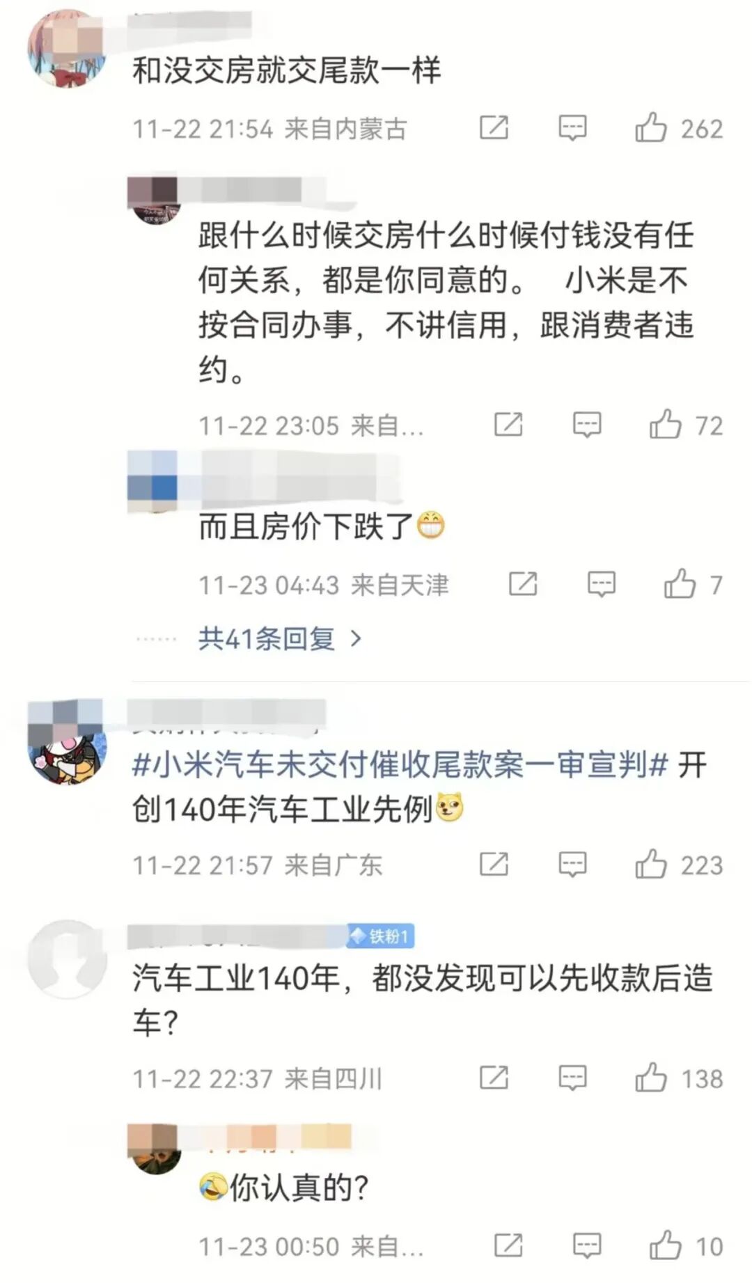 除此之外,小米“未交付车辆却要求消费者提前支付尾款”的操作,前段时间引发了大众热议。