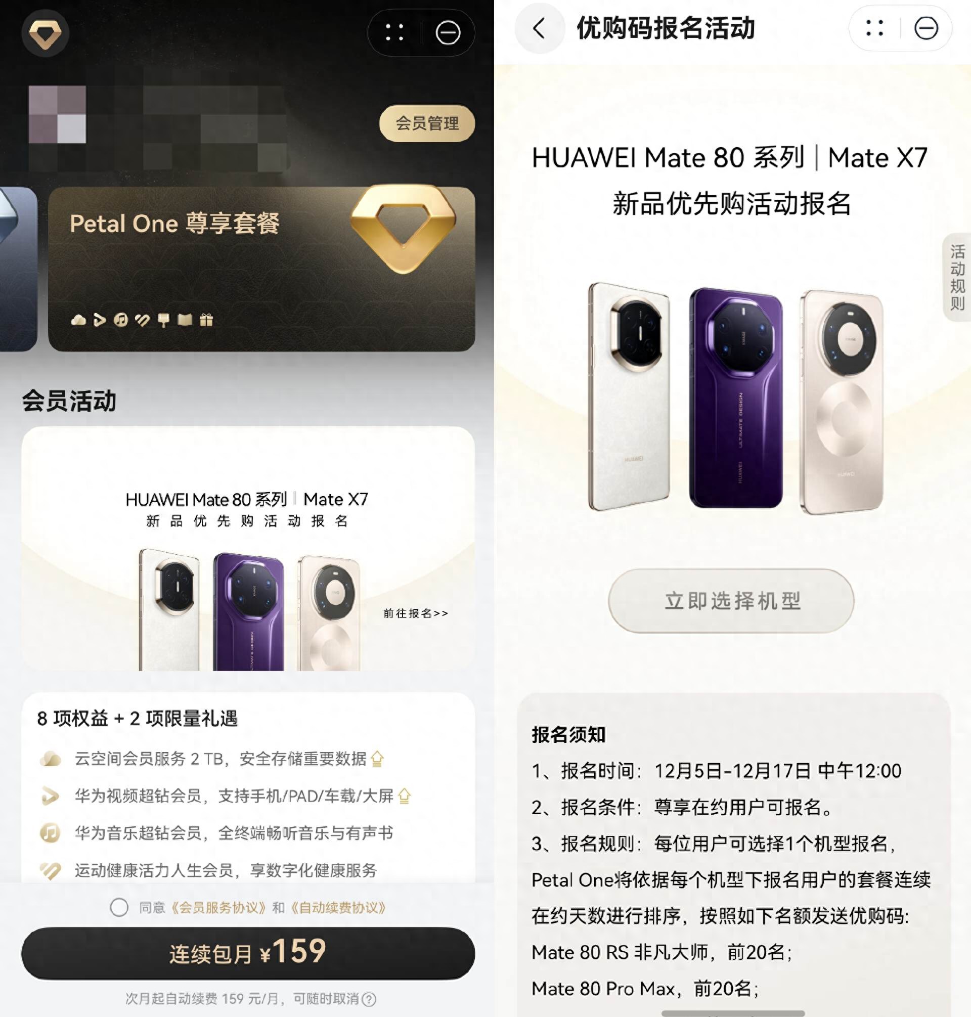 最近华为Mate 80系列开售即磬!我也蹲守失败,忽然想到的我订阅了Petal One尊享套餐——每年2次华为终端新品优先购参与资格。我赶紧去Petal One的会员订阅页面,果然看到了优先购报名入口,有三款机型可选,分别是华为Mate 80 RS、Mate 80 Pro Max和Mate X7,填个信息就报名成功了。按照会员在约天数排序,在约时长越久机会越大,以我的资历大概率能排到吧。