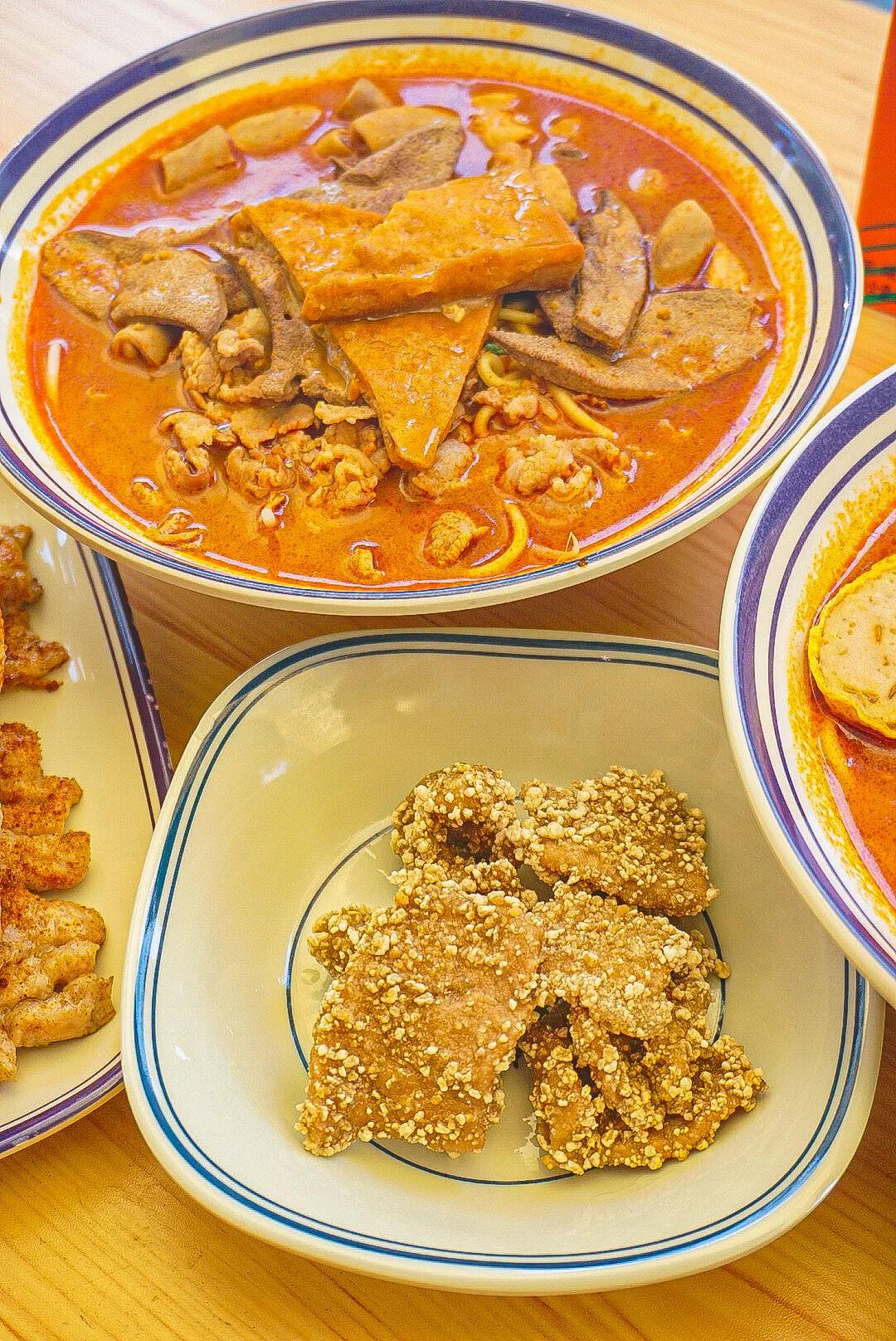 沙嗲汤底不同于厦门本地版沙茶面的甜润,漳州版的汤头带着漳州特有的味道,印尼进口的沙嗲粉、闽南本地的花生酱、十几种香料交融,还带着辣椒的辛辣,红亮的辣油在汤面透着诱人的色泽!懂得吃的朋友都知道!要赶早才能喝到头汤,那滋味!那一碗香喷喷浓郁的沙爹汤真是让人想起来就又想再来一碗的!