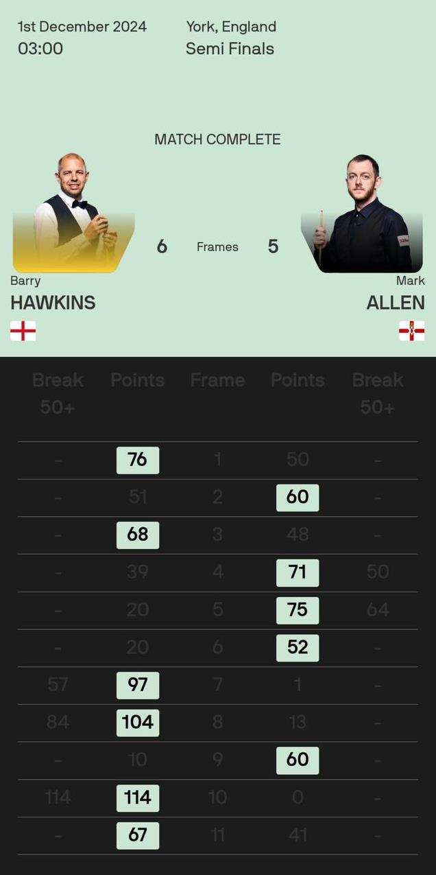 本场比赛,开杆即陷入缠斗,霍师傅76-50超分拿下首局,艾伦清至黑球60-51扳平,第三局,霍金斯68-48,零敲碎打中重获领先;接下来,艾伦突然来了电,连续打出单杆50、64,一波三连鞭反超大比分,来到4-2;老霍不甘示弱,回以57、84分两杆单杆致胜,4-4追平大比分;艾伦多次上手,60-10完成超分,先达赛点;霍金斯轰一杆114分破百,抹平赛点;决胜局简直令人窒息,两人在41-41的比分纠缠多时,攻防转换中,艾伦留下破绽,霍老师哪敢放过,上手连得20分,超分卷走胜利,强势挺进自己的第10次排名赛决赛。