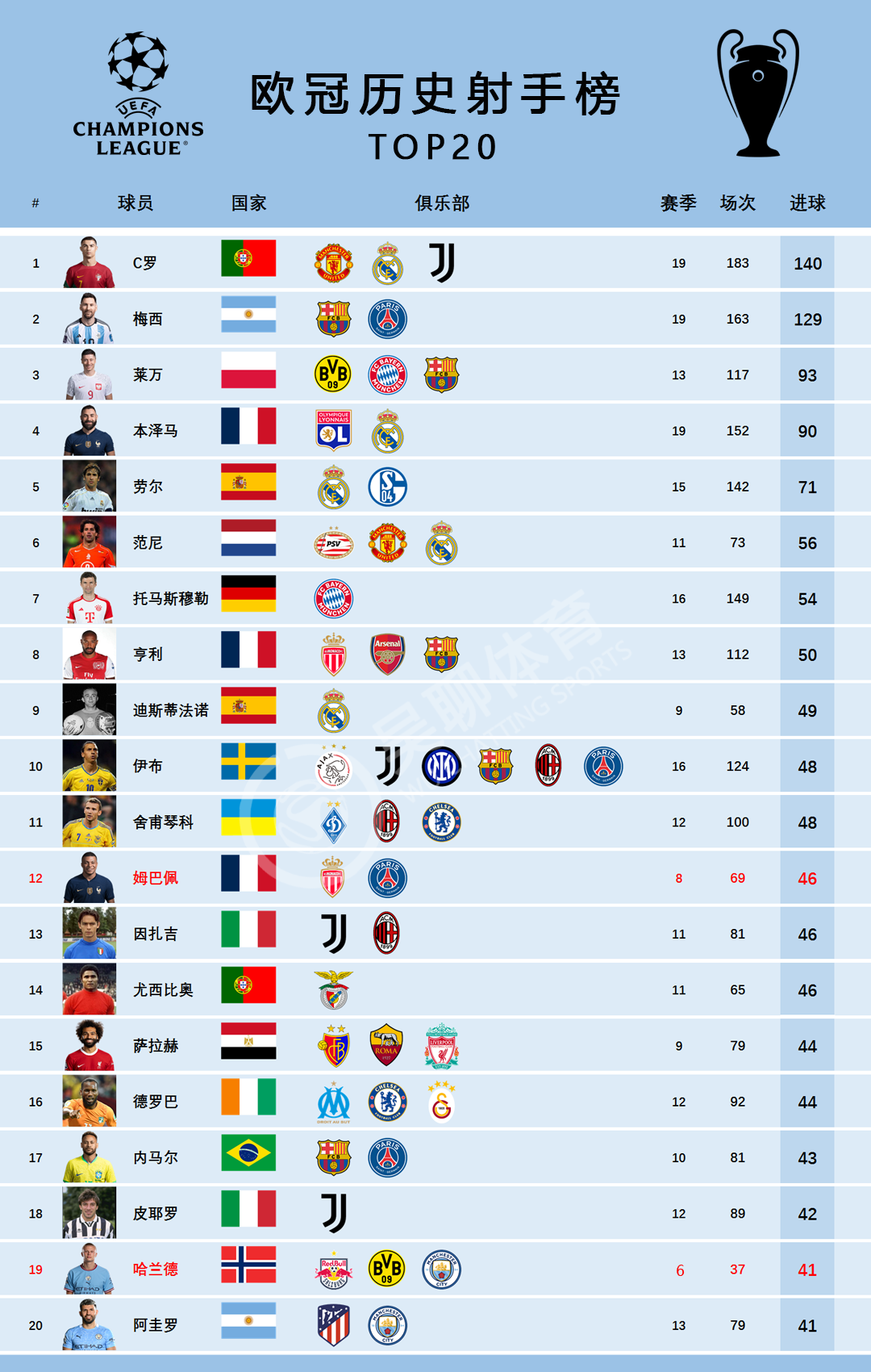 截止至2023/24赛季欧冠16进8淘汰赛,欧冠历史射手榜最新榜单,姆巴佩进球数追平因扎吉、尤西比奥上升到第12位,哈兰德超越曼城前辈阿圭罗排在第19位。