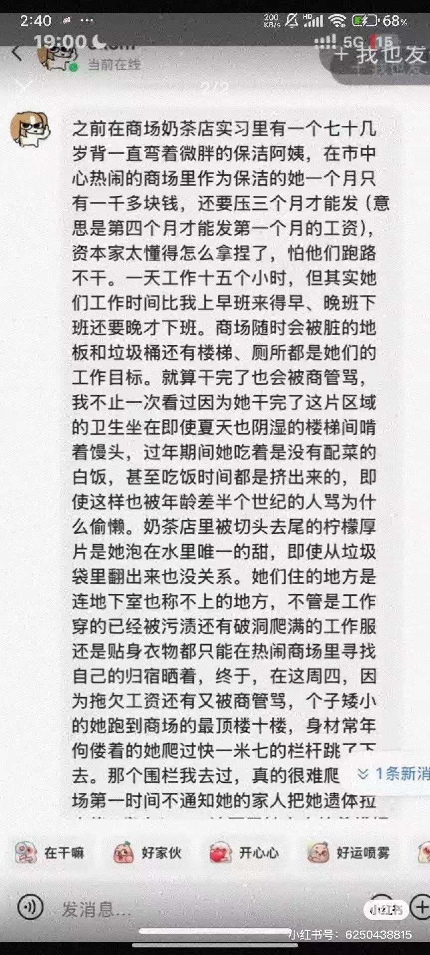 “七十多岁弯着腰”“一天工作十五个小事”“工资一千多,还要压三个月”“被年龄差了半个世纪的商管人员骂”“啃着馒头,吃着没有配菜的白饭”......